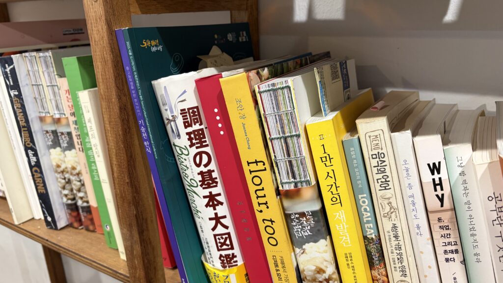 壁際には食に関する本がたくさん並んでいた。日本語で書かれた本も。