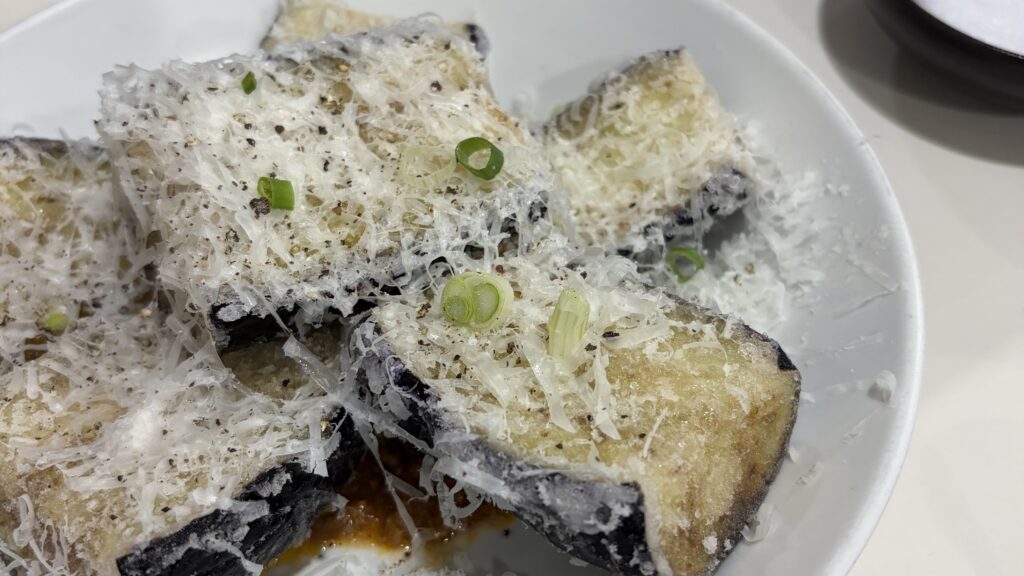 右は揚げたナスにラグソースをかけたもの。こちらは結構しっかりめの味わいだった。とろけるようなナスの食感が病みつき、また食べたい。