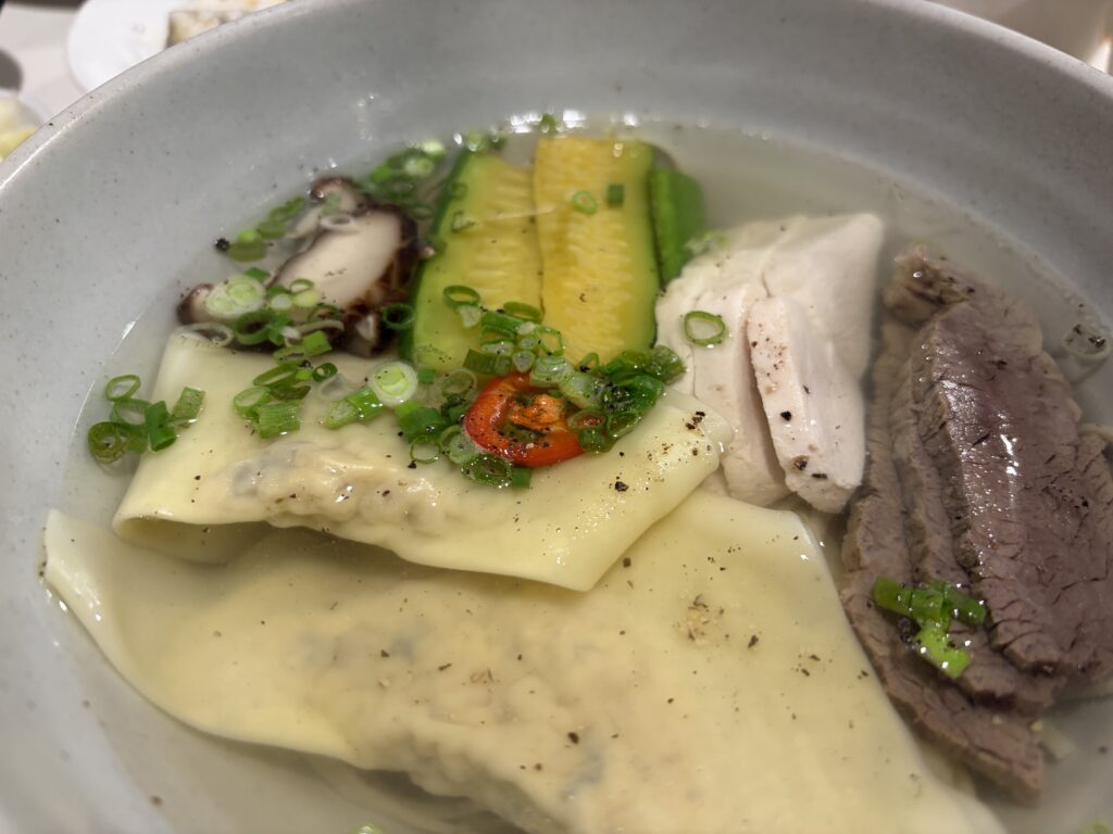 左は牛と鶏の出汁をブレンドしたスープに、歯切れの良い麺がメインの料理。かなり優しい味わいで、ホッとする。