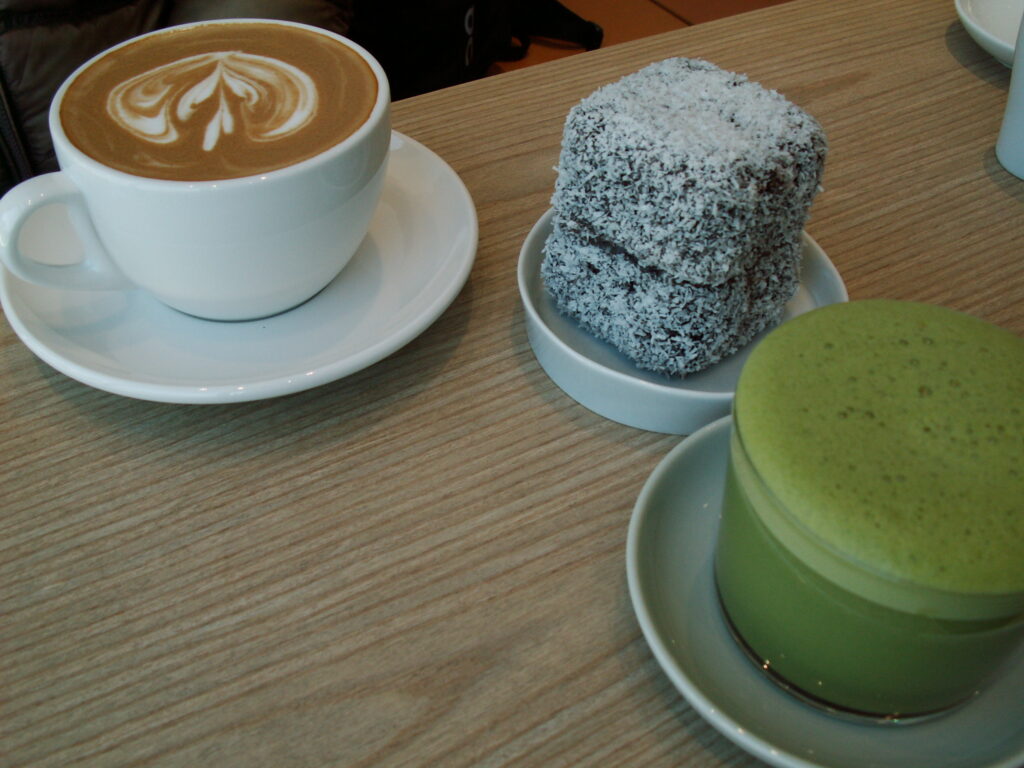 抹茶のカプチーノと四角いケーキ、面白いメニュー。ごちそうさまでした!