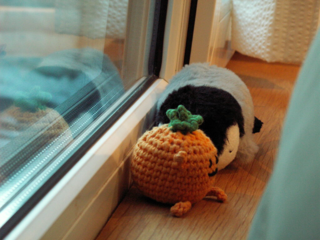 足を抱えて座る何か。頭に雪が積もっているのも可愛い。